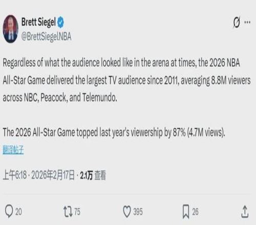 北京时间2月17日,据NBA记者Brett Siegel报道,2026年NBA全明星正赛收视人数公布:在NBC、Peacock和Telemundo三大平台平均观众人数达到880万,创下自2011年以来,近15年全明星正赛的最高收视纪录,比2025年(470万)暴涨了87%。