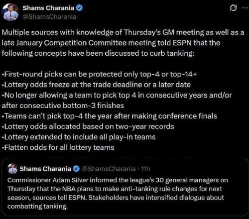 在Shams的进一步扩充介绍中,详细介绍了多种方案,包括首轮前四或者前十四保护,禁止球队连续两年获得前四签位,进入分区决赛的球队次年不能获得前四签位等。