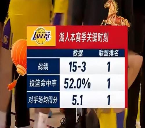 比赛结束前转播方给出,湖人关键时刻15胜3负联盟第一,那么此役后湖人关键时刻就是16胜3负延续联盟第一,投篮命中率、对手场均得分也均为联盟第一。