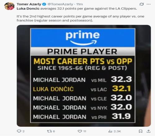 赛前快船记者晒出对阵LAC场均得分最高排行榜,乔丹场均32.3分第一,东契奇场均32.1分第二,所以东契奇打快船是有心得的,快船记者希望能限制住他。
